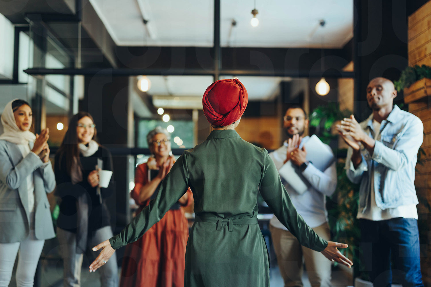 Muslim businesswoman receiving an applause from her colleagues during a staff meeting. Rearview of a successful team leader giving a speech in a multicultural workplace.