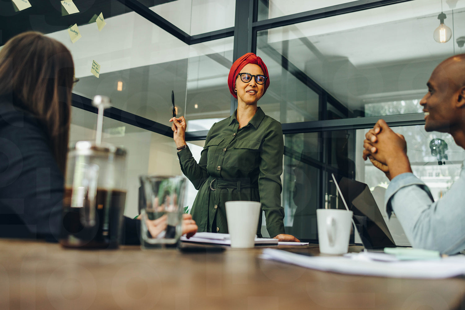 Creative businesswoman sharing her ideas with her team during a meeting. Muslim businesswoman leading a discussion in a boardroom. Team leader wearing a headscarf in a multicultural workplace.