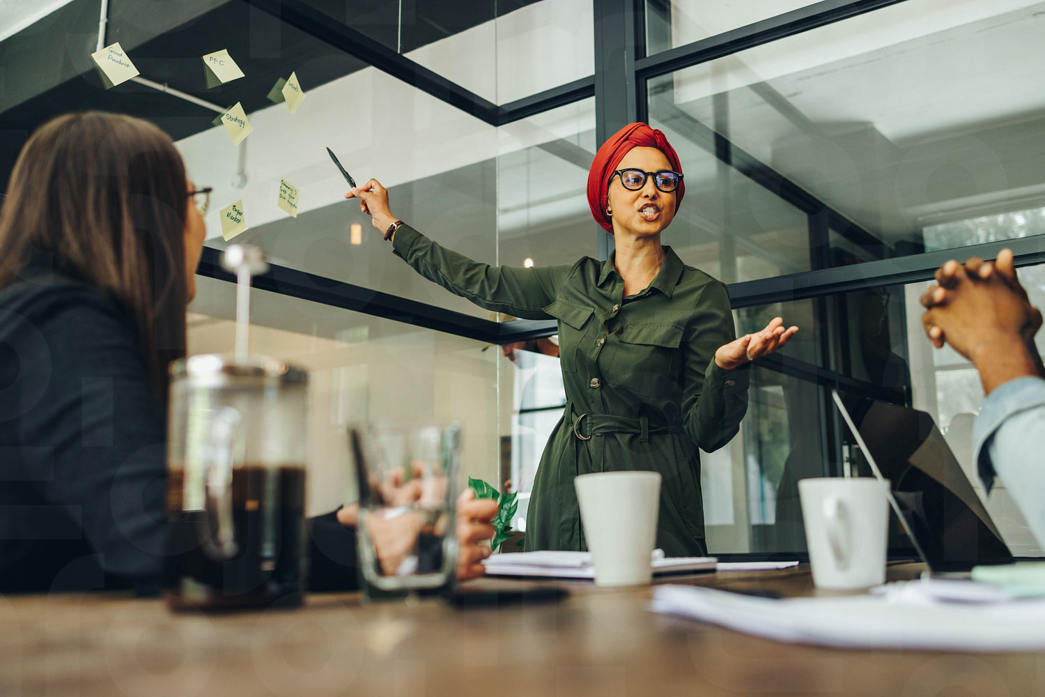 Creative businesswoman having a meeting with her team in a boardroom. Muslim businesswoman using sticky notes while discussing her ideas. Businesswoman wearing a headscarf in a multicultural workplace.