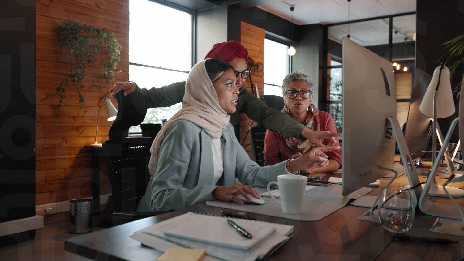 Team of creative business women having a discussion around a computer in a multicultural coworking office. Female professionals brainstorming ideas for a social media advertising campaign.