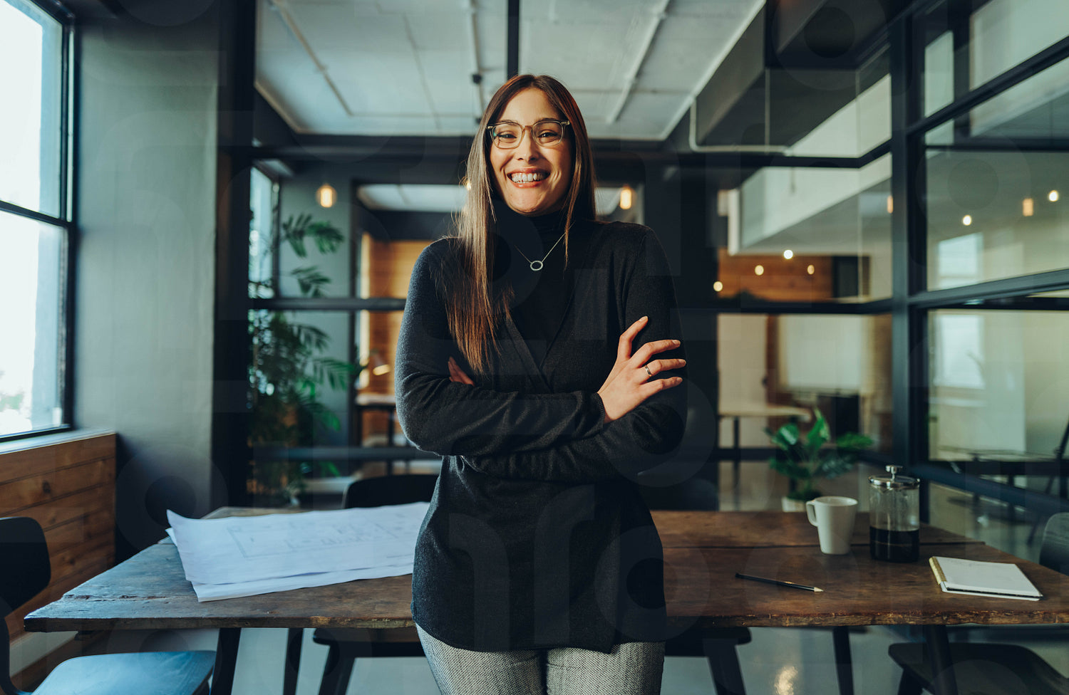 Female business professional smiling at the camera while standing with her arms crossed. Cheerful young businesswoman standing in the boardroom of a modern workplace.