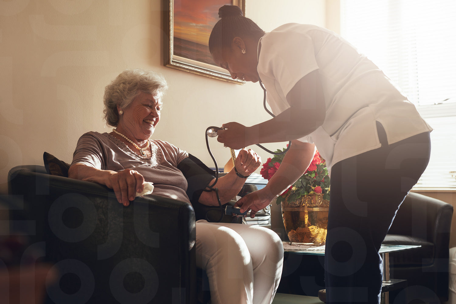 Nurse measuring blood pressure of senior woman patient in retirement home. Home caregiver doing routine checkup of a mature female patient.