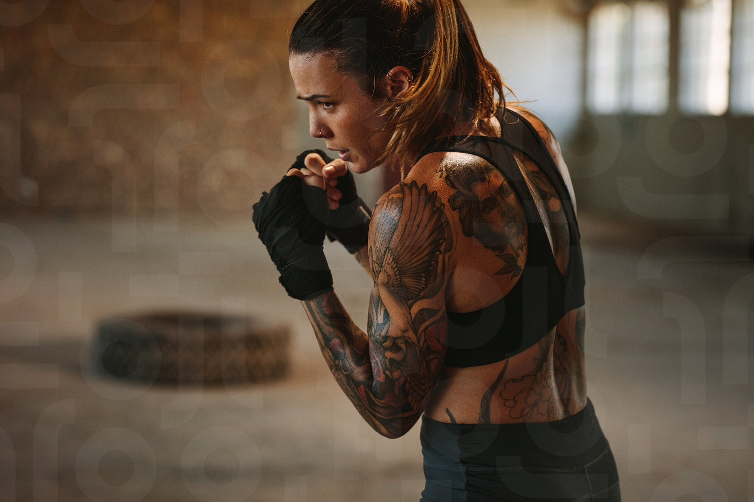 Female doing shadow boxing in empty factory shade. Tattooed woman in sportswear practicing her punches at an old warehouse.