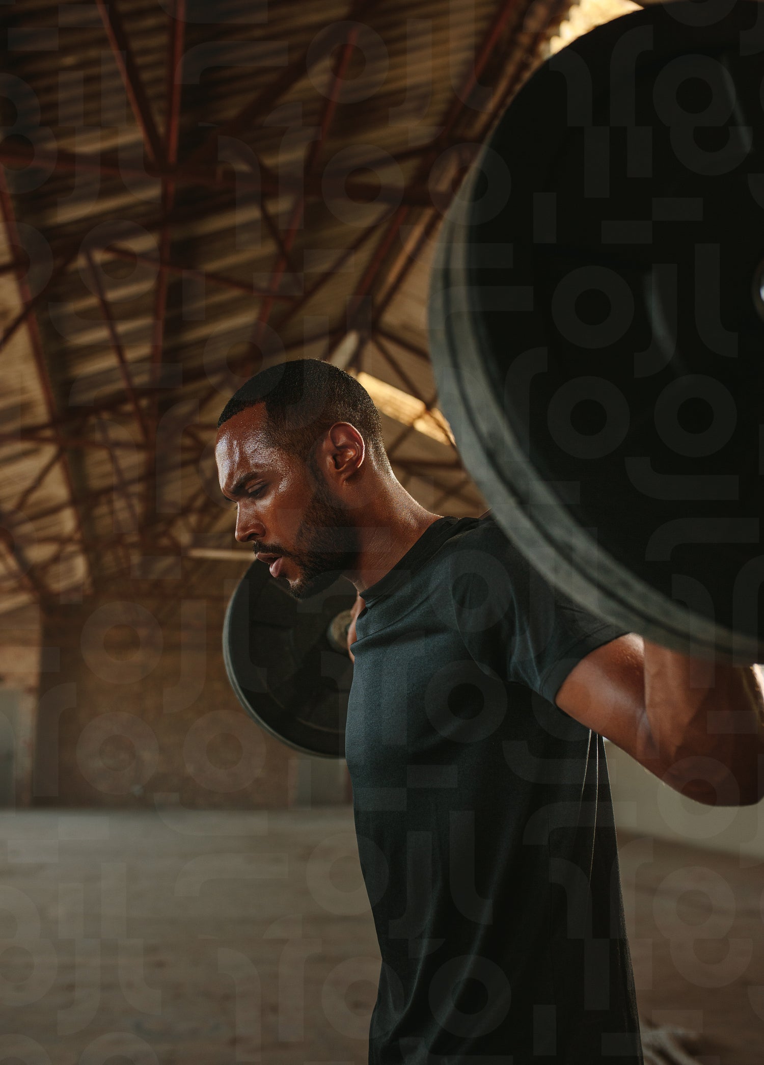 Strong ma exercising back squats with a barbell. Man doing squats with heavy weights in old factory shade.