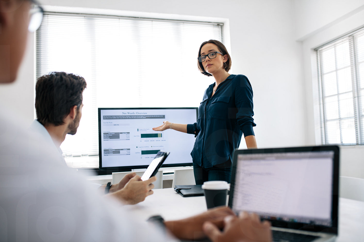 Businesswoman wearing spectacles making a presentation to her colleagues in office. Office colleagues looking at laptop computers while listening to a presentation sitting at the conference room.