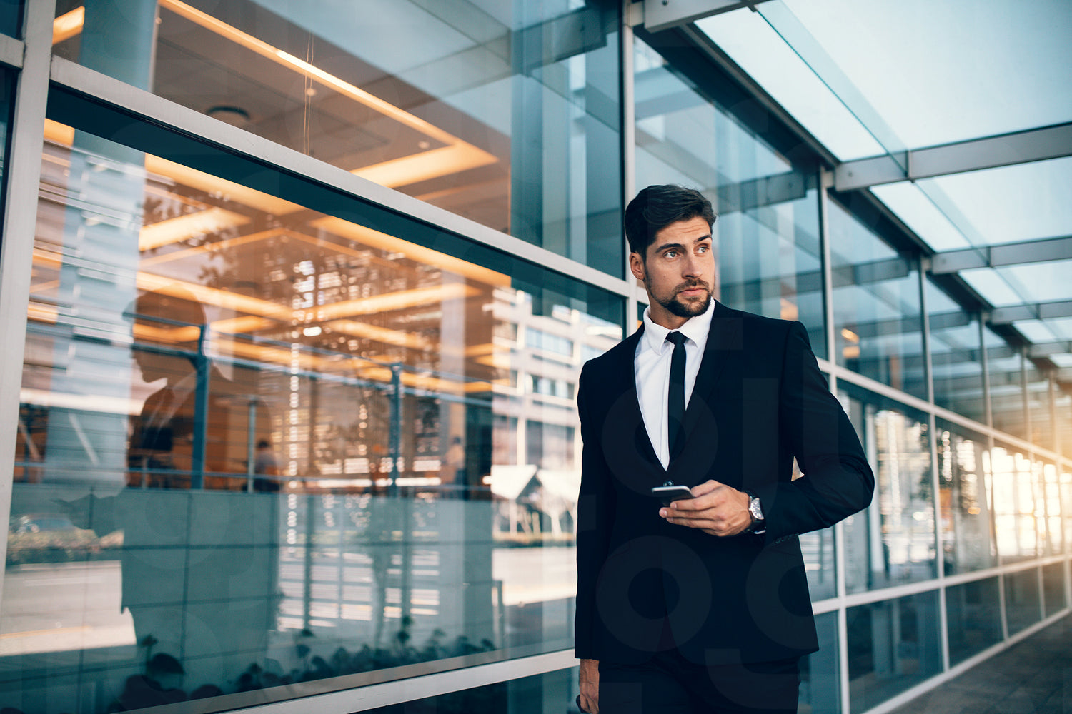 Handsome businessman walking with mobile phone. Businessman with cellphone in airport.