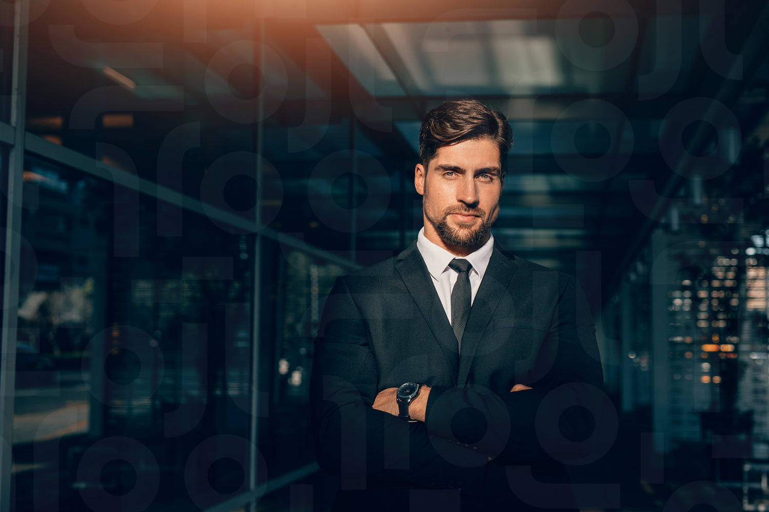 Portrait of handsome young businessman standing with his arms crossed and looking at camera. Caucasian male executive standing in a modern building.