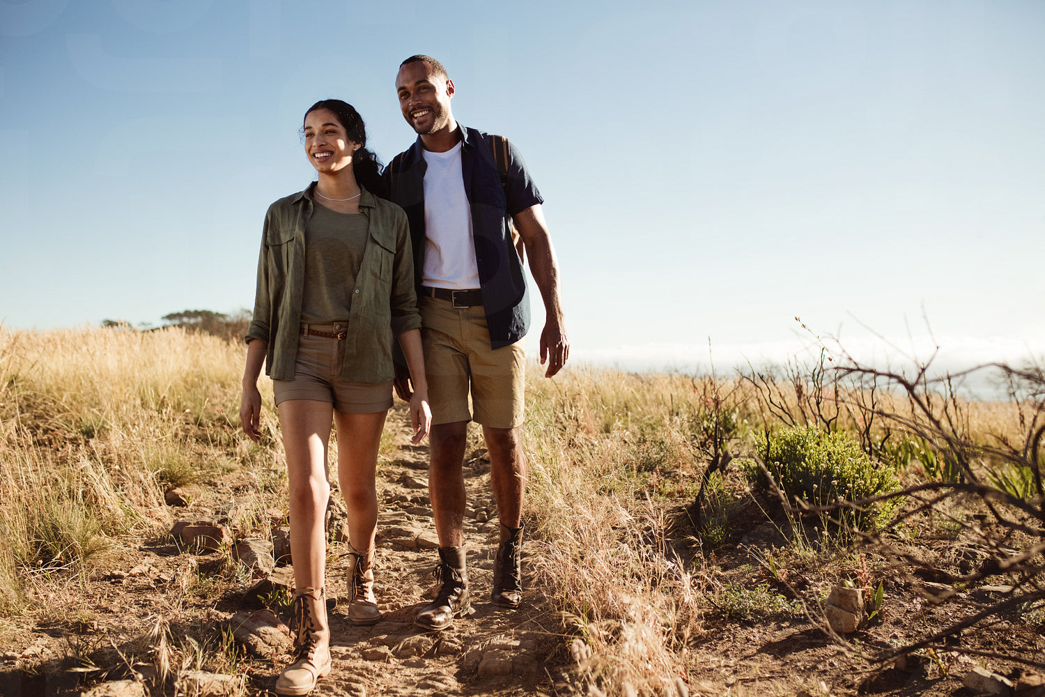 Couple enjoying a hiking trip on a summer day. Cheerful couple walking together on a hiking trail.