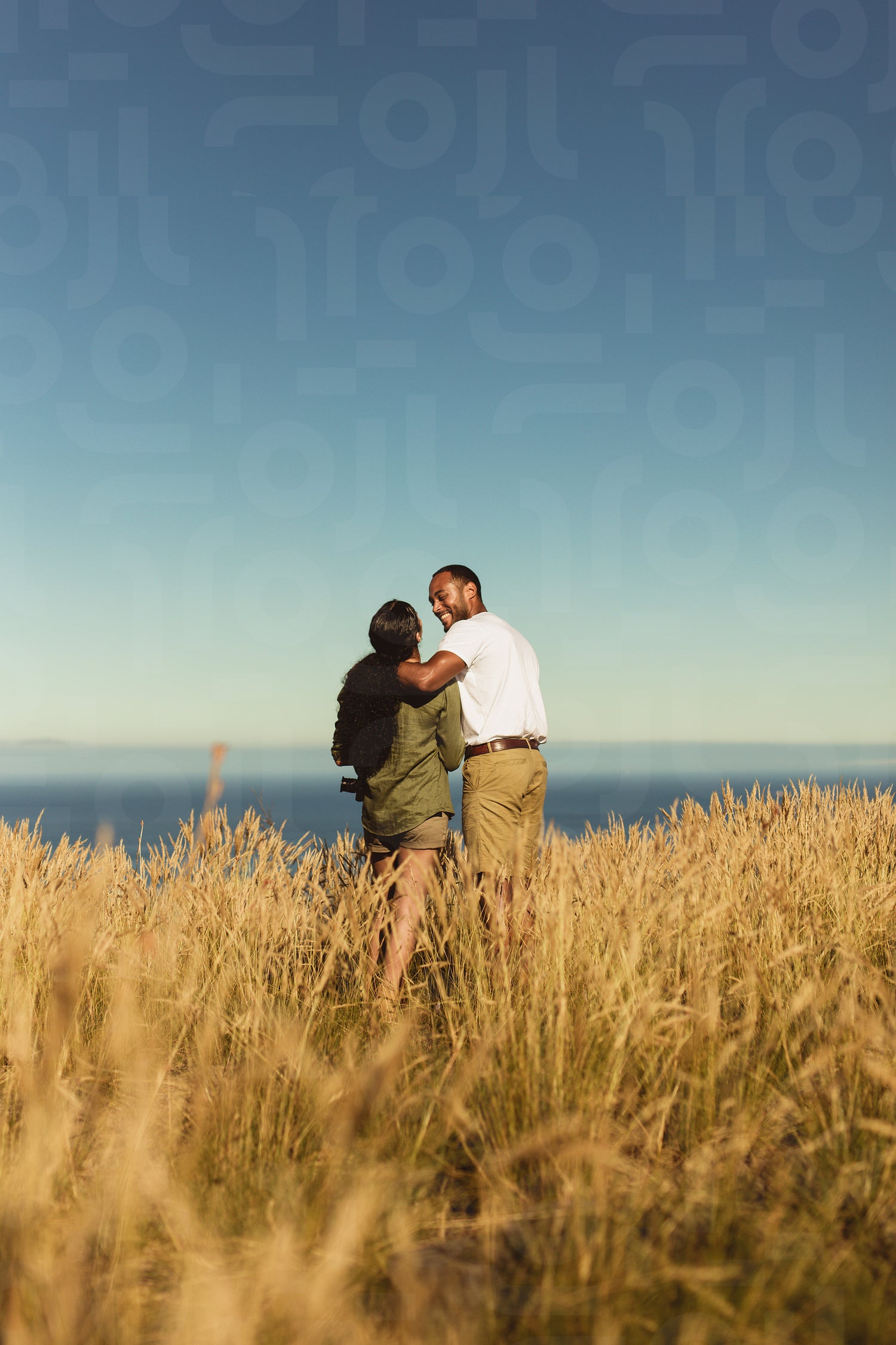 Rear view of a romantic couple standing together in a field. Portrait of a couple on holiday enjoying the beauty of nature.