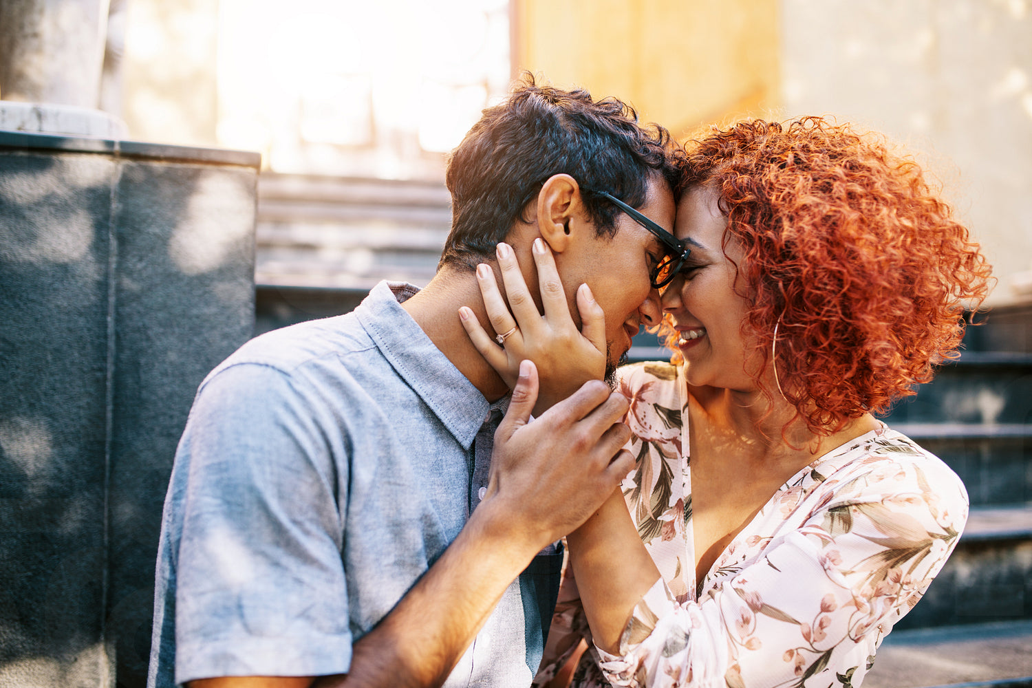 Close up of young romantic couple sitting intimately close on steps touching their foreheads. Happy young man and woman in romantic mood expressing love.