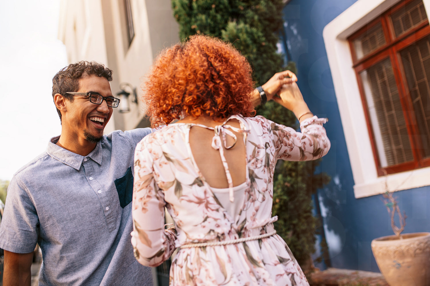 Happy couple dancing and having fun outside their house. Smiling man holding hand of his partner while dancing.