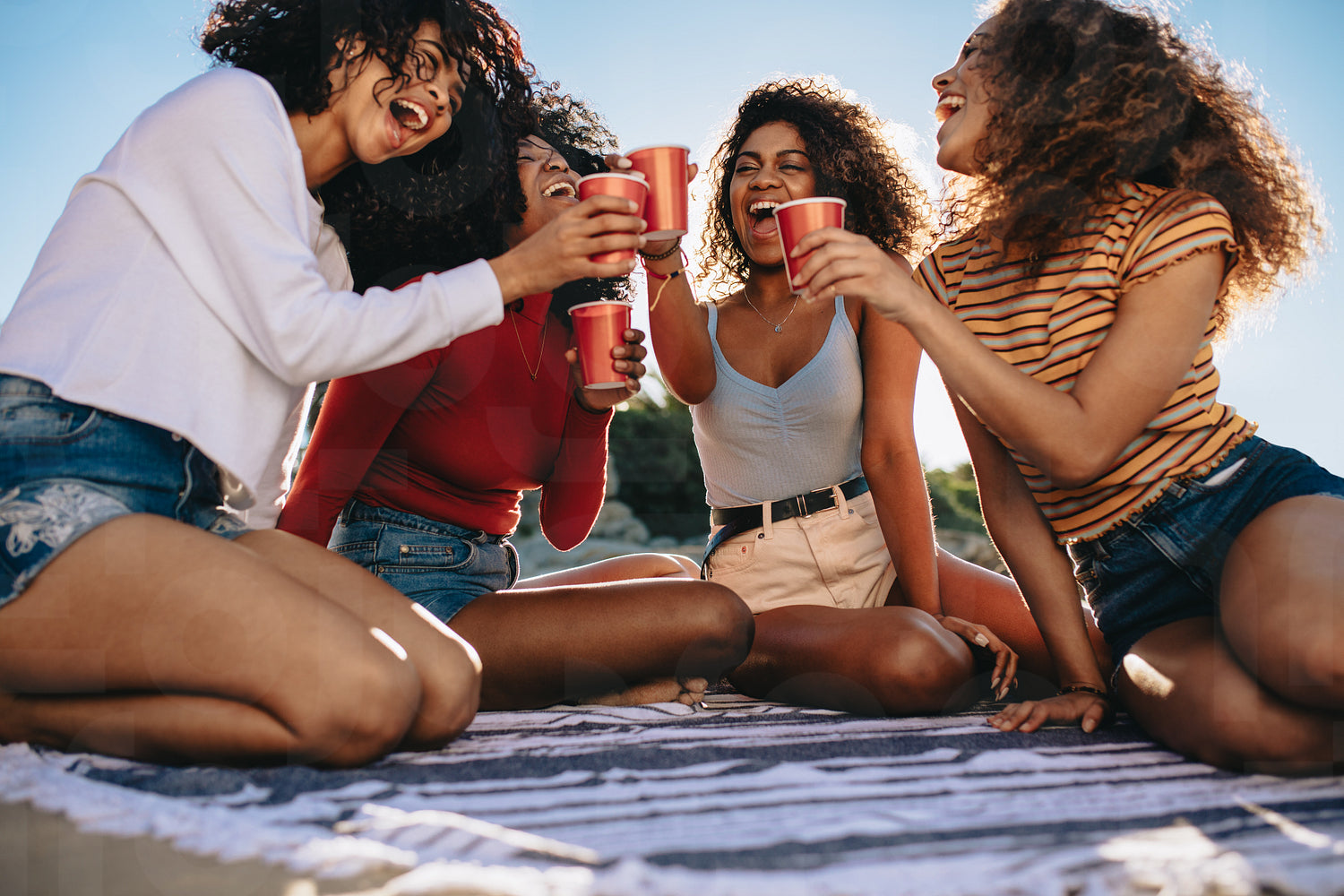 Group of females sitting together on blanket and toasting drinks. Cheerful women friends having cola at the beach.