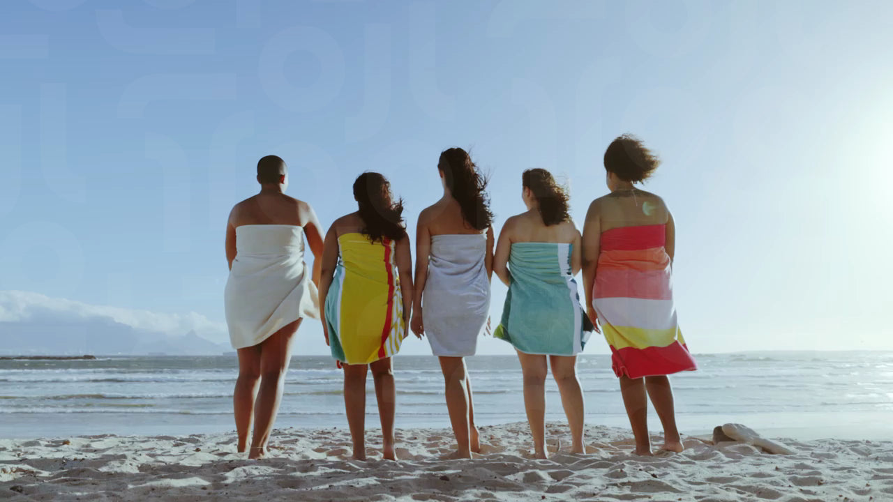 Rear view shot of different sized women wrapped in towel standing on the beach and doing the mexican wave. Multi-ethnic women friends having fun on summer vacation.