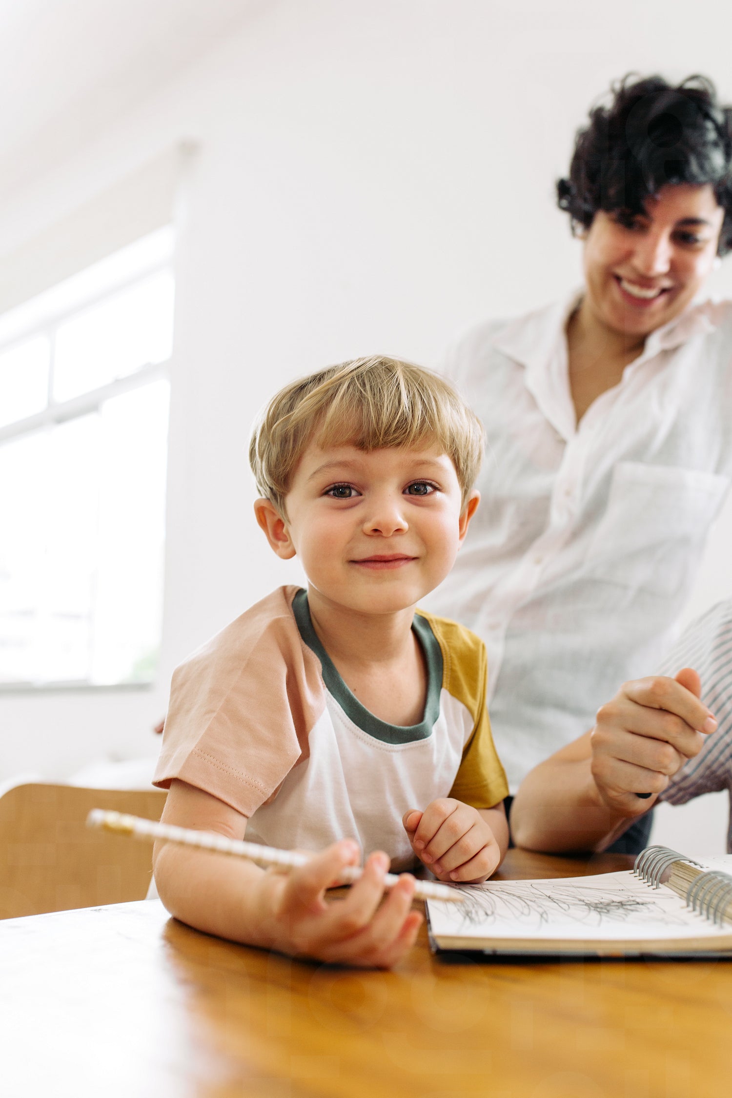 Portrait of a cute boy sitting at table looking at camera. Small kid holding pencil with book on table and his parents at the back.