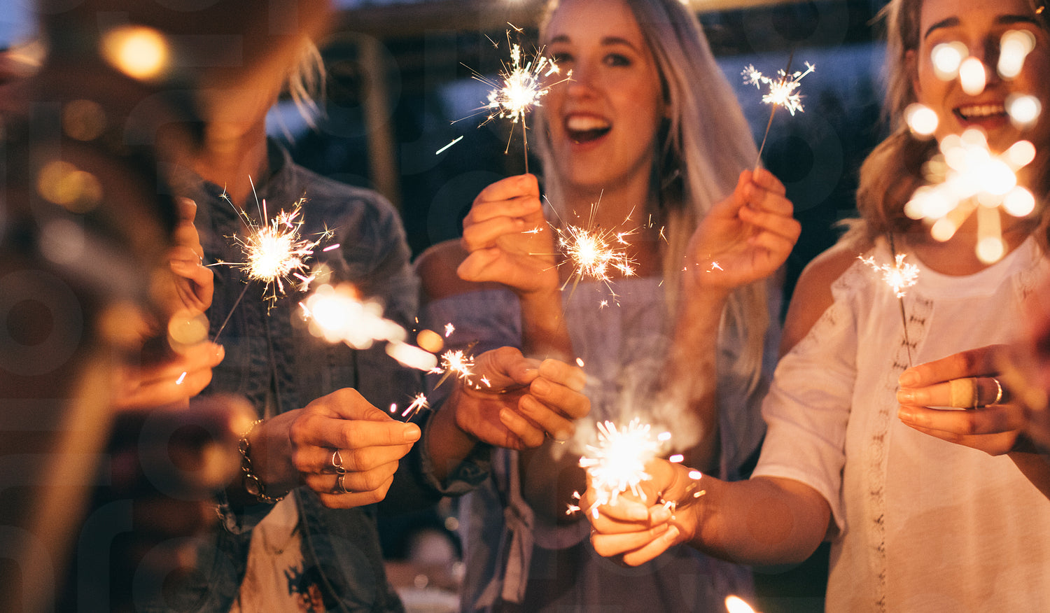 Group of friends enjoying with sparklers in evening