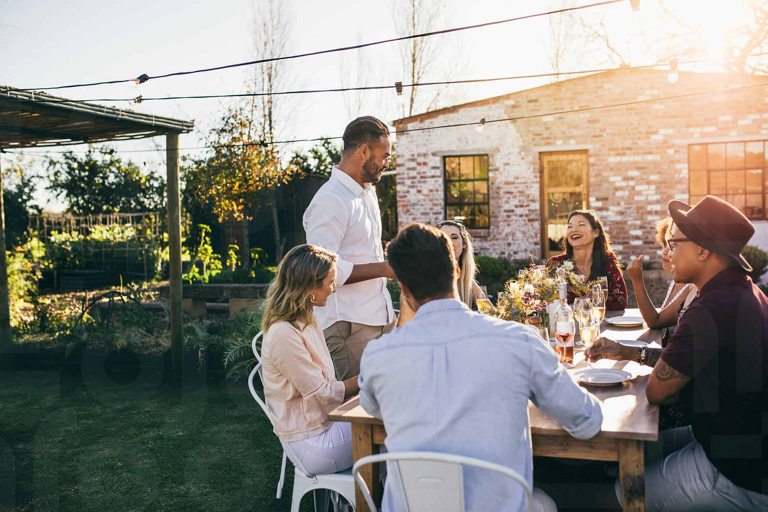 Man giving a speech to group of friends at party. Young people celebrating a special occasion sitting around a table in garden restaurant.