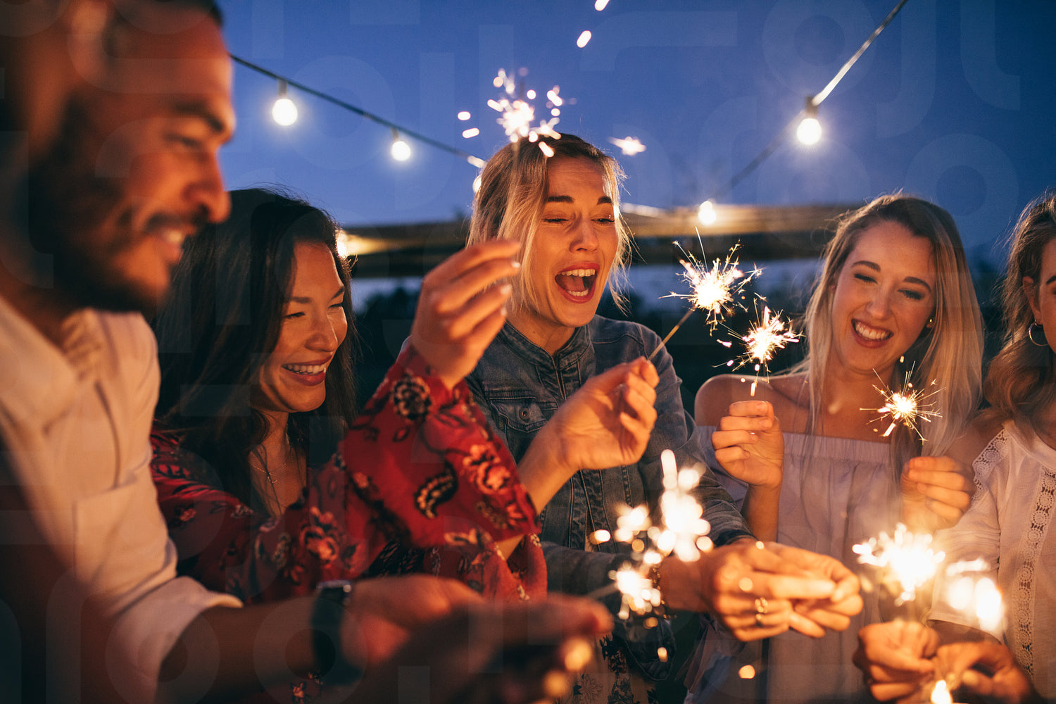 Young men and women enjoying with fireworks. Group of friends with sparklers enjoying outdoor party.