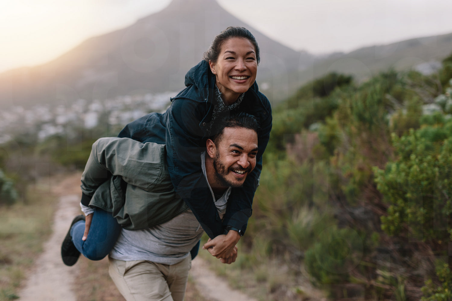 Handsome young man carrying his girlfriend on back. Couple enjoying piggyback ride in countryside.