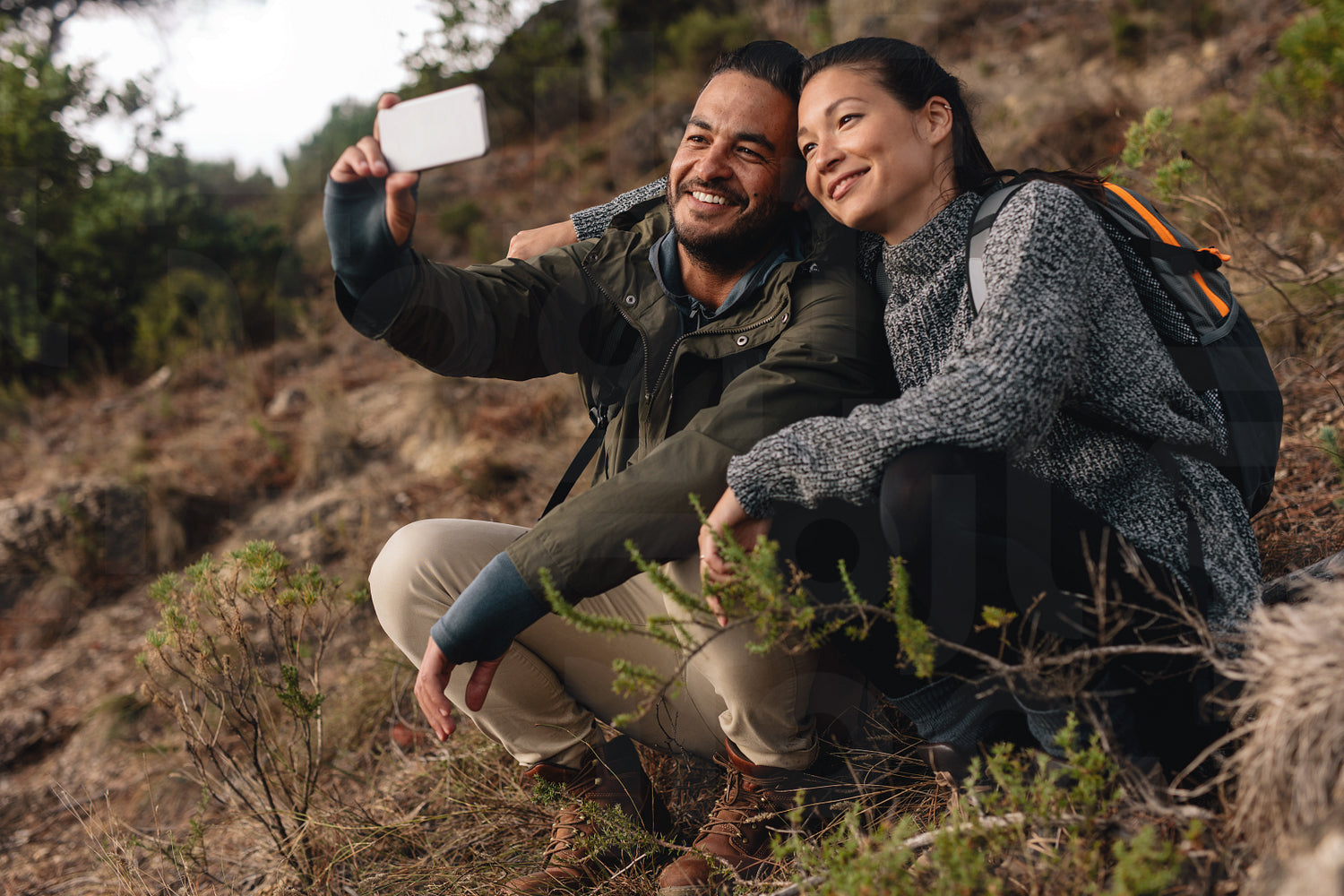 Couple in love sitting on mountain trail and taking selfie. Young man and woman hiking in countryside and talking self portrait with mobile phone.