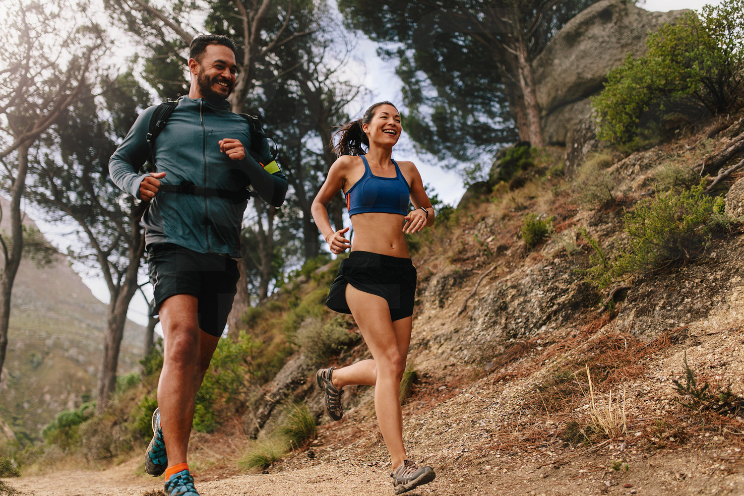 Low angle shot of healthy young couple running on mountain trail in morning. Young man and woman jogging on country path.