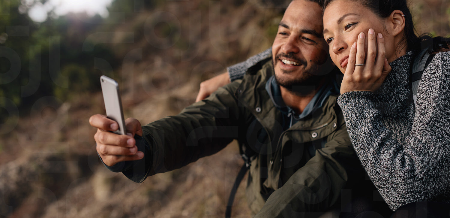 Horizontal shot of loving young couple on hike taking a self portrait with smartphone outdoors. Relaxed hiker couple on holiday taking selfie with cell phone.