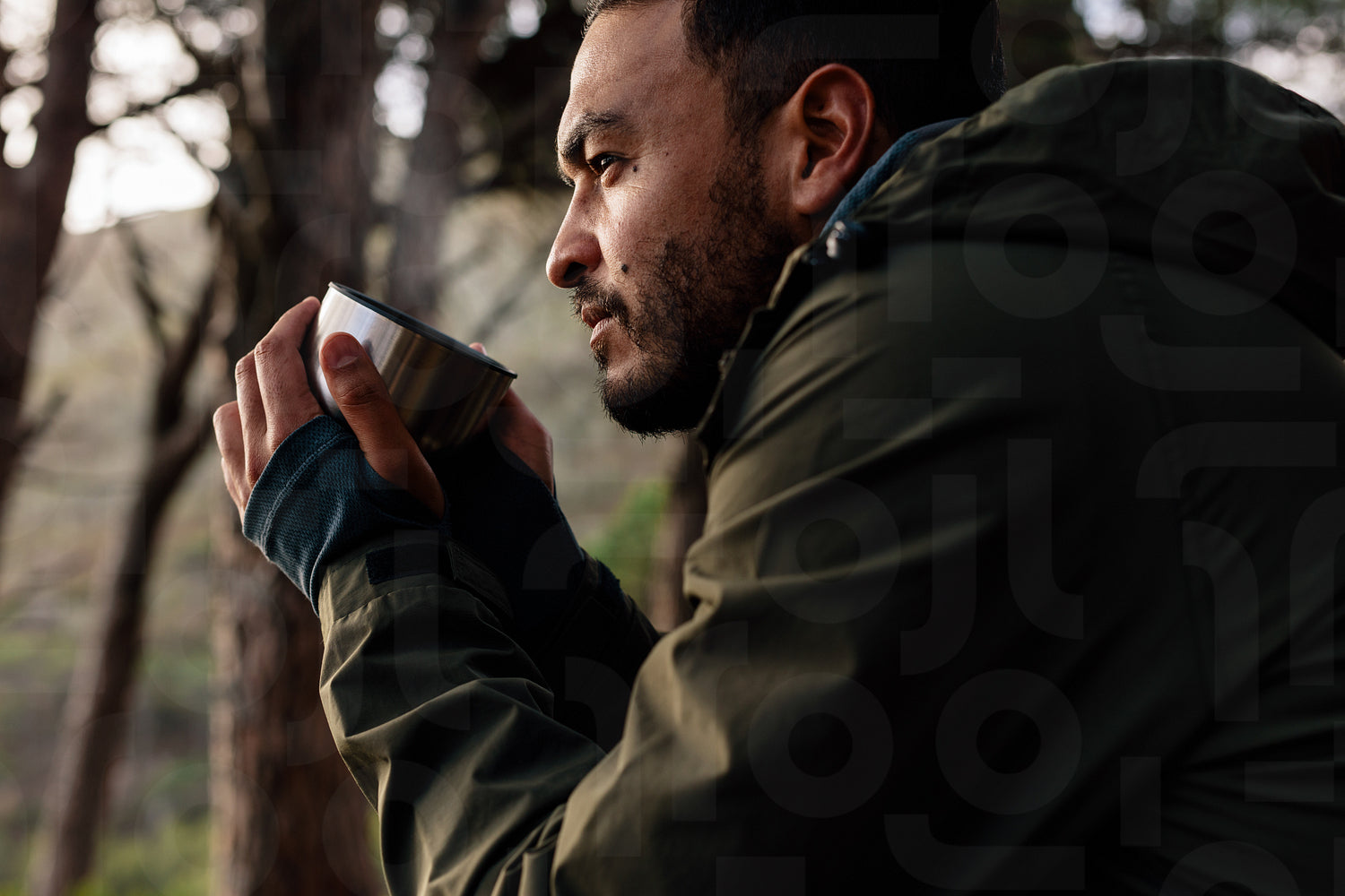 Close up shot of young man drinking hot coffee, taking break during hiking. Male hiker taking rest outdoors.