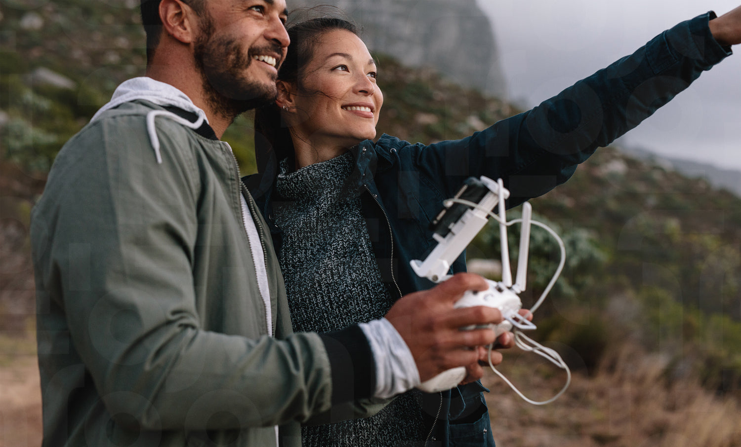 Happy young couple standing together outdoors with man holding a remote control for drone operation and woman pointing away. Man and woman flying drone outdoors in countryside.