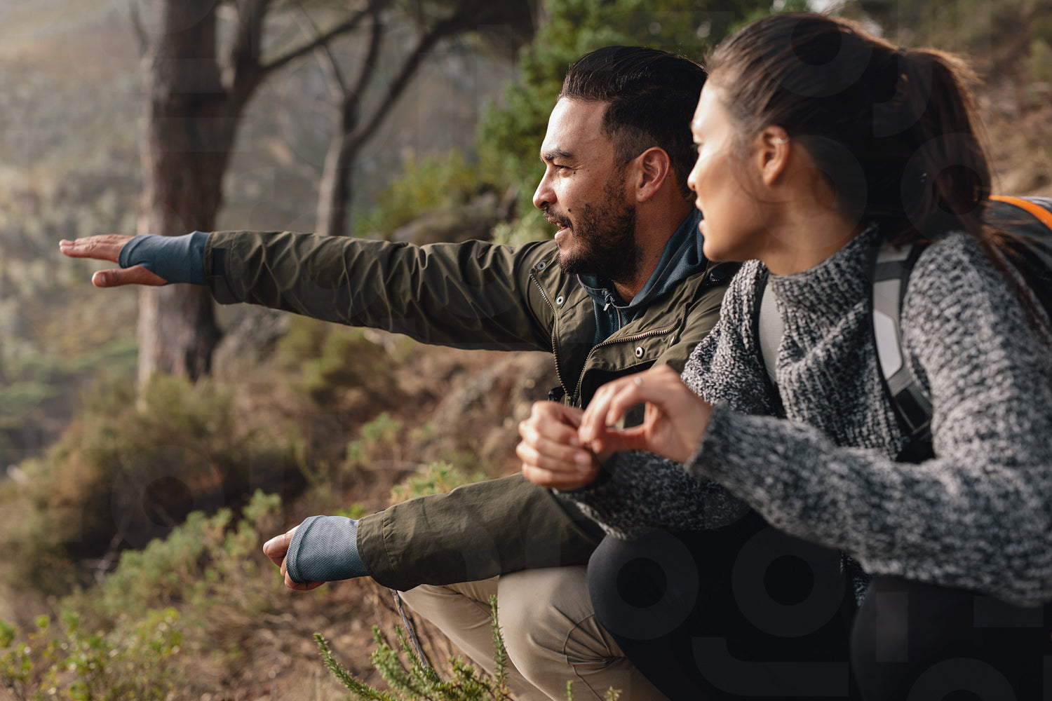 Young couple relaxing, with man showing something to woman. Young couple hiking on mountains.