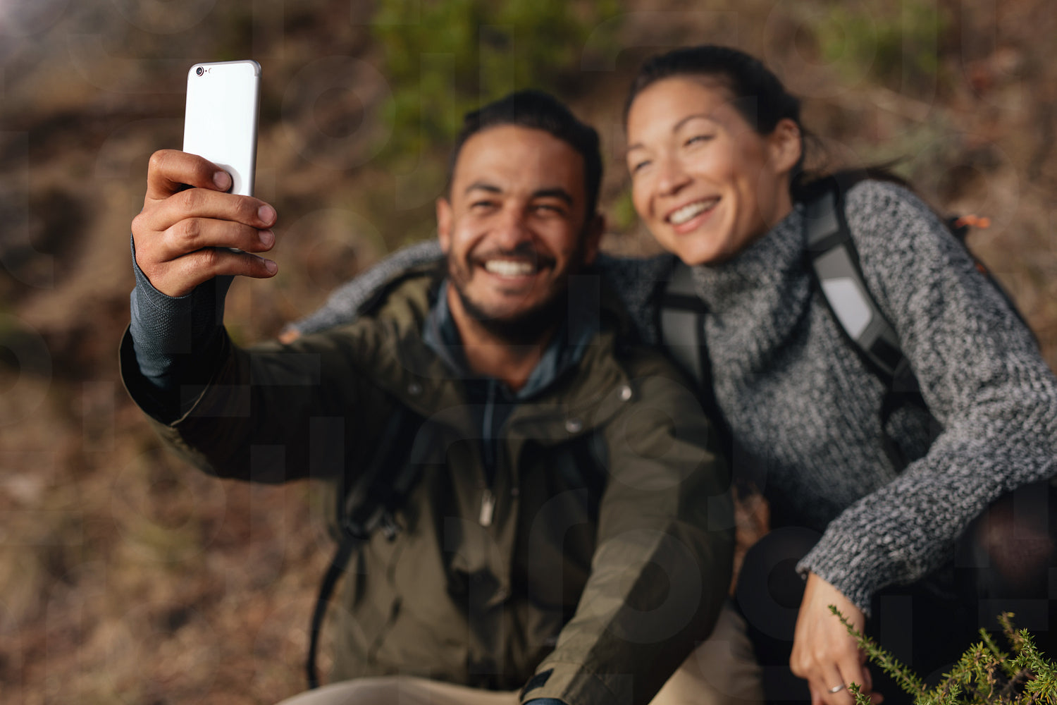 Young couple hiking taking selfie with smart phone. Happy young man and woman taking self portrait.