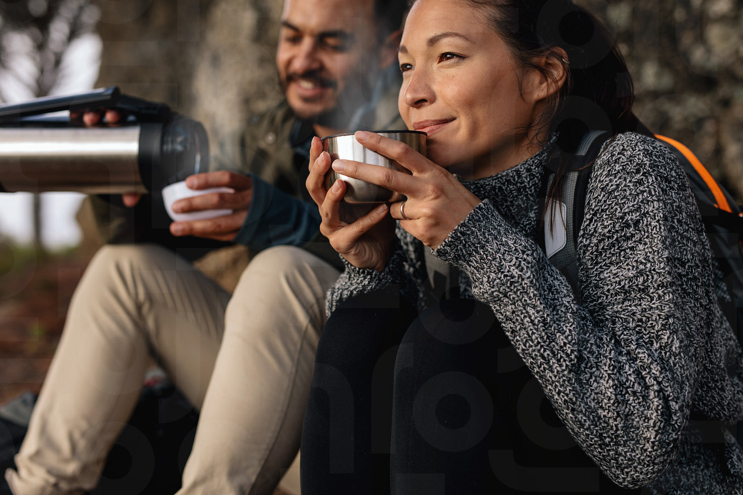 Young couple taking a break on a hike. Man and woman drinking coffee while out hiking.