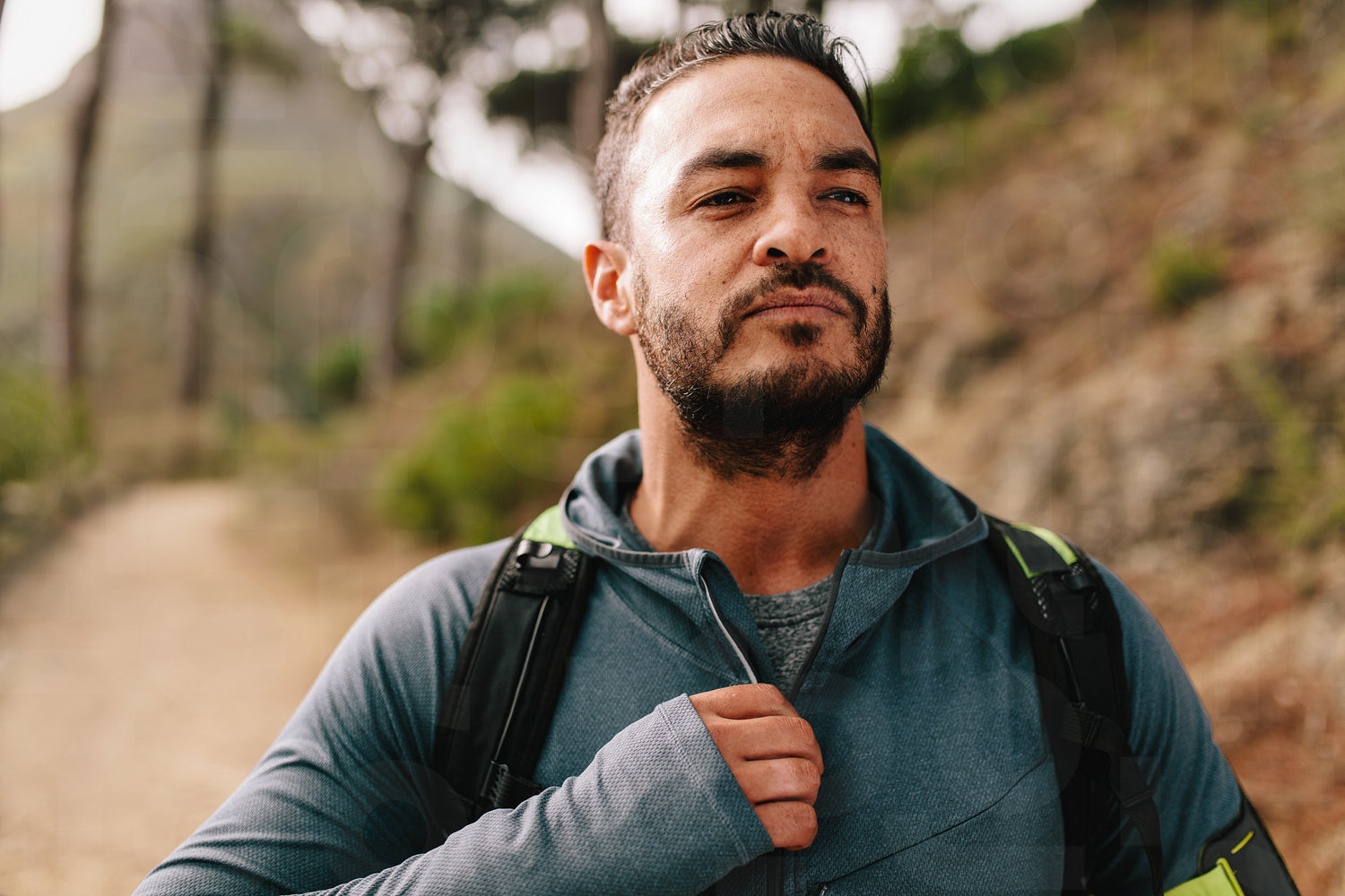 Portrait of young caucasian man outdoors during morning training. Young male runner on country road.