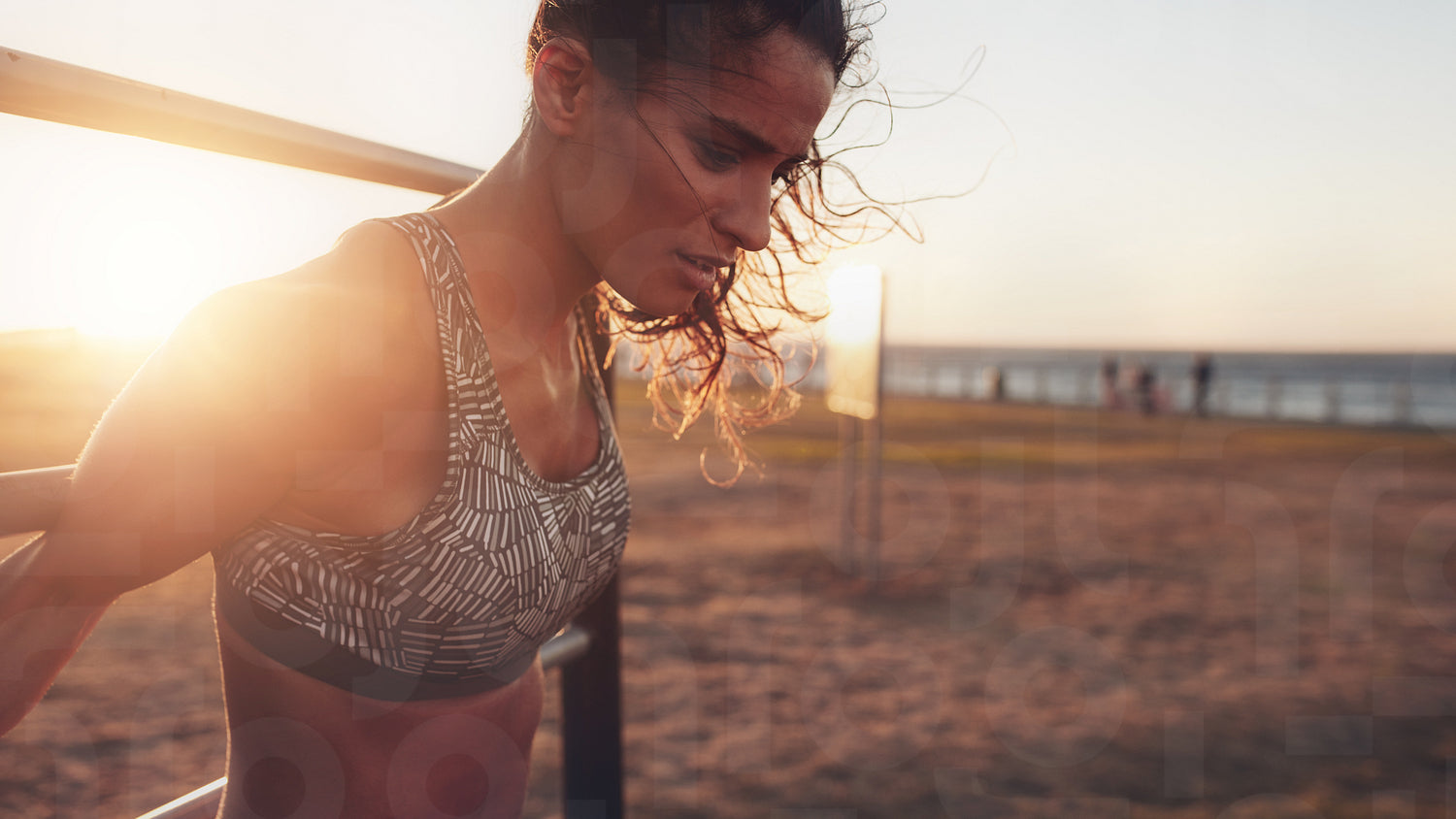Close up shot of strong young woman exercising on wall bars outdoors.