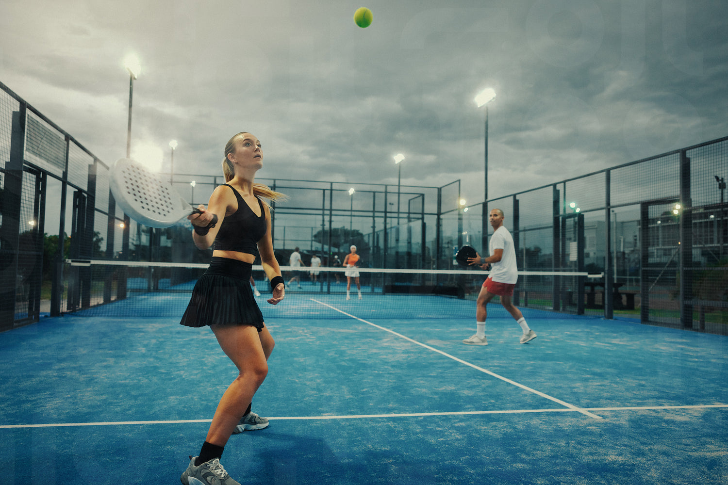 Athletic woman playing in a padel match during the evening. Skilled female player competing with a padel racket, focusing on the ball and getting ready to hit a smash. This photo has intentional use of 35mm film grain.