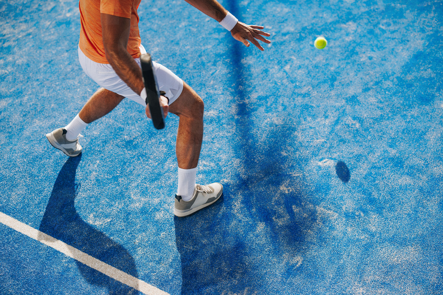 Intense padel match: Young athlete dominates championship game with a forehand strike