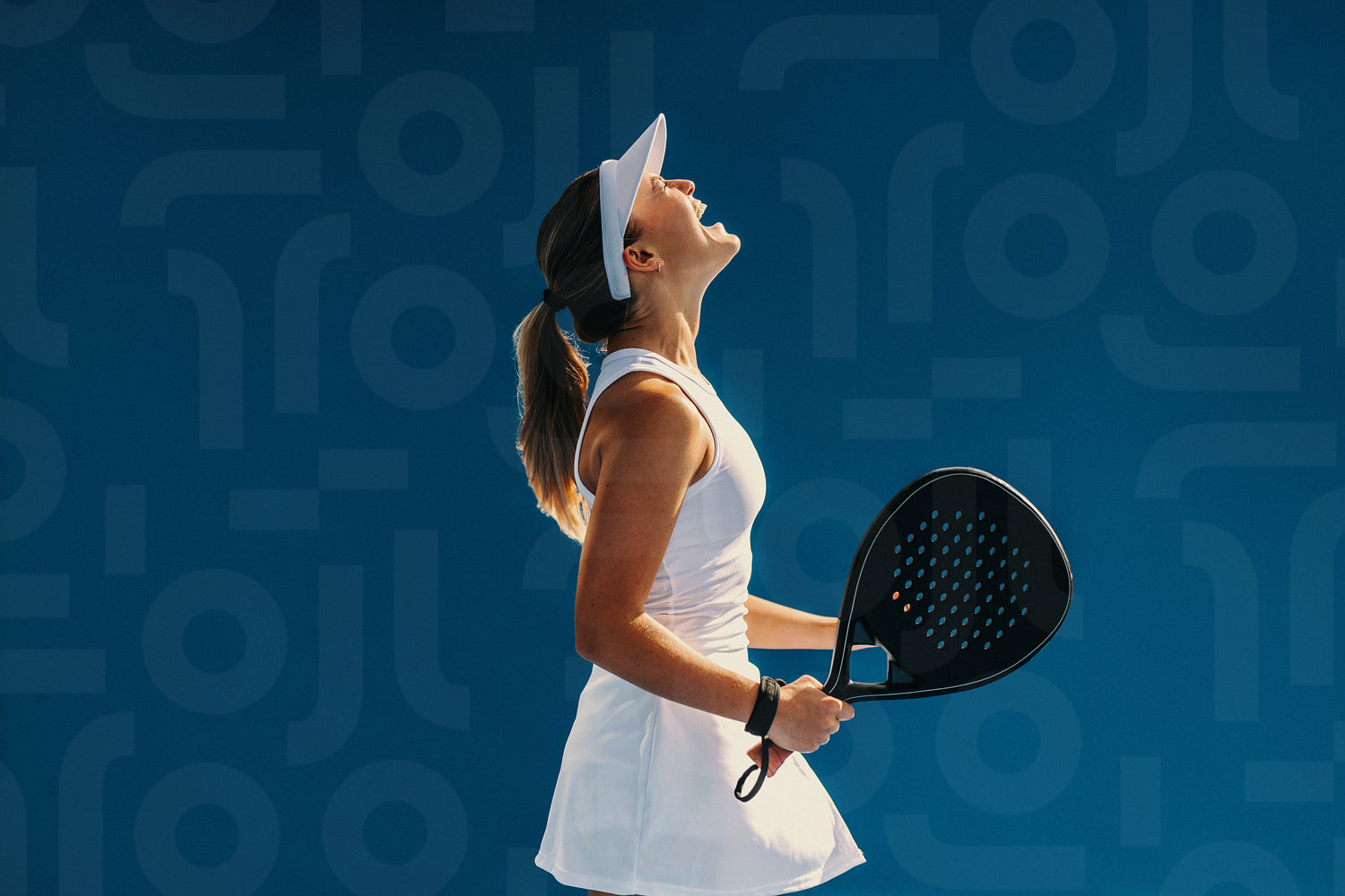 Happy female padel player celebrates her championship victory on court. Competitive sportswoman holding her racket and cheering with excitement after a thrilling padel match. This photo has intentional use of 35mm film grain.