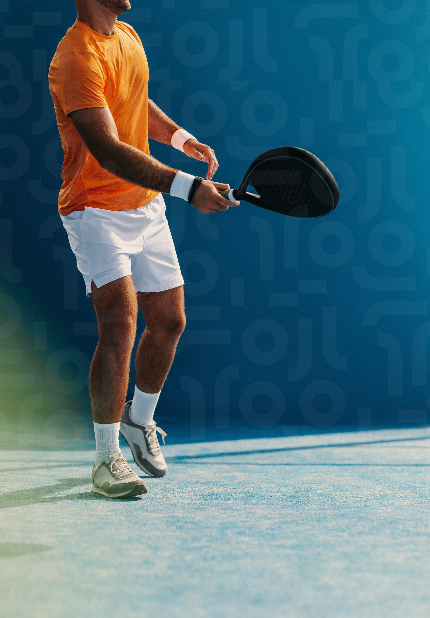 Player swinging his racket as he waits for the ball in a padel match. Man moving with precision on the padel court, getting ready for his opponent's move in the thrilling racket game. This photo has intentional use of 35mm film grain.