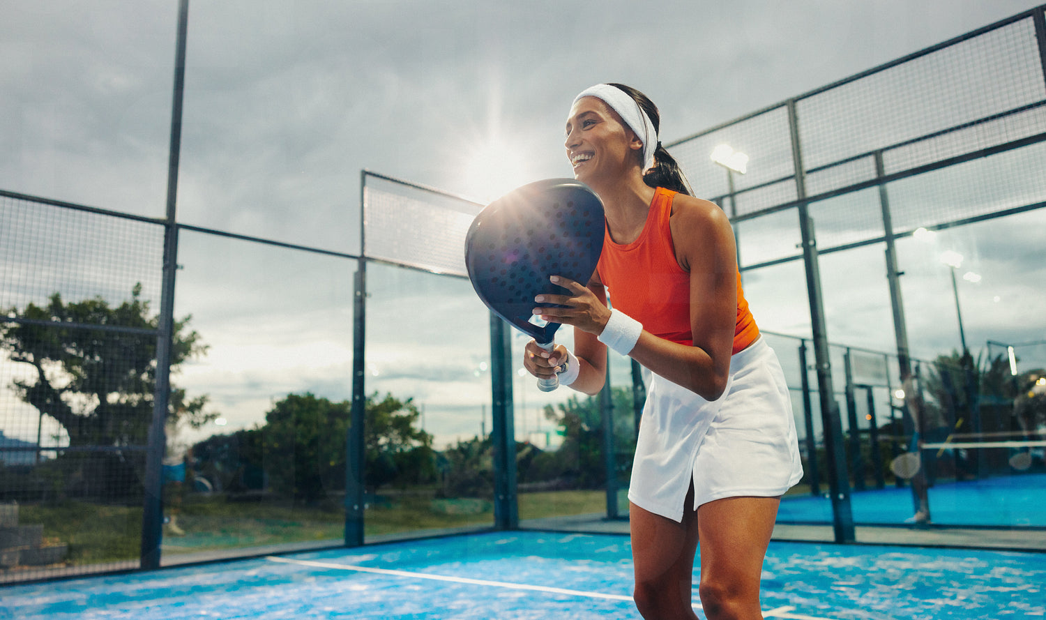 Ready and smiling: Young female athlete training on padel court