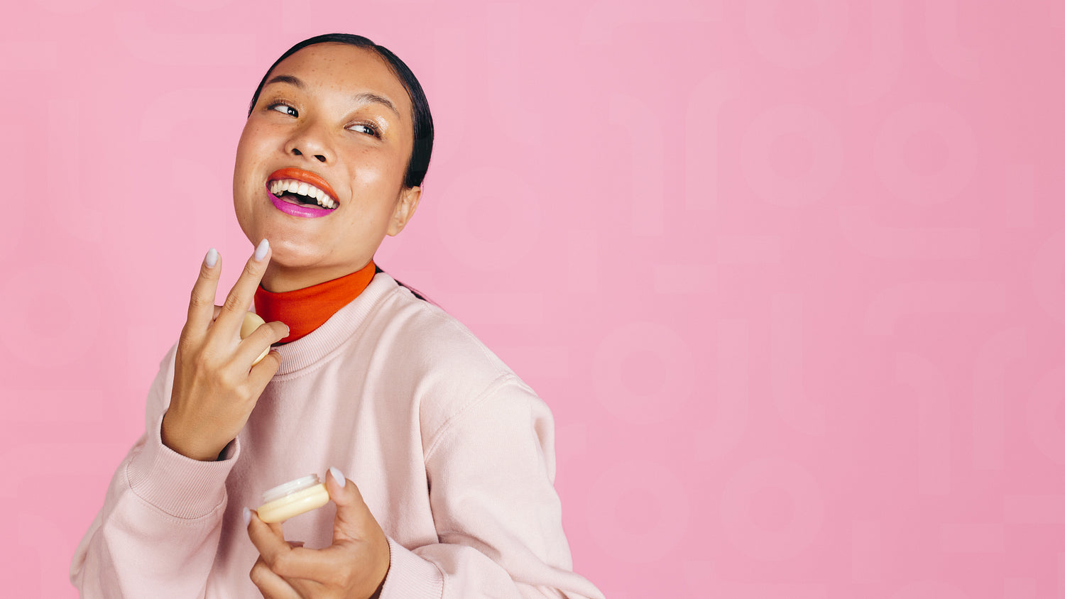 Happy young woman looking away and applying cream foundation to her face, she is relaxed and standing in a studio. With her self-care and beauty routine, she is committed to a perfect makeup look.