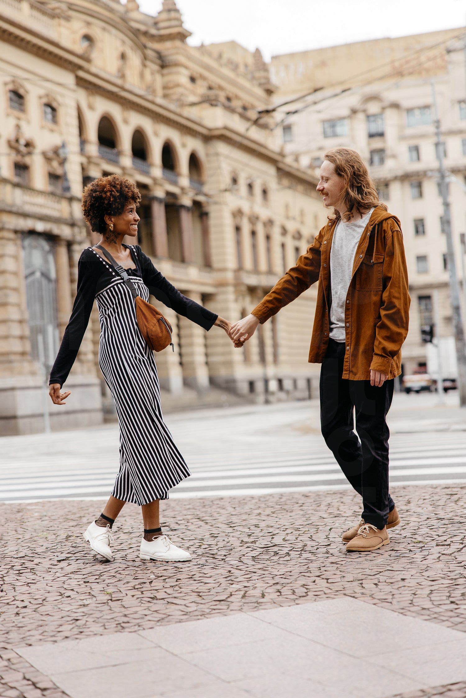 A young and stylish couple enjoys a leisurely walk, hand in hand, along the vibrant city streets, showcasing urban love and connection.