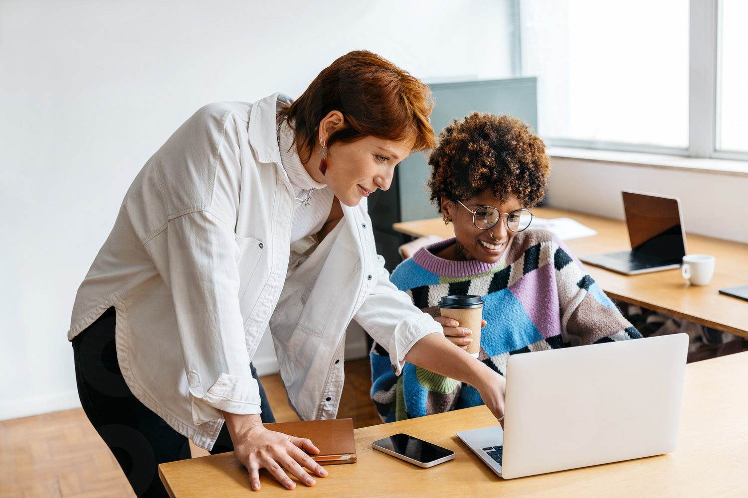 A well-lit co-working space where freelancers are collaborating. Two colleagues are engaged in a project discussion with laptops, smartphones, and a coffee cup visible, depicting a typical freelance office setting.