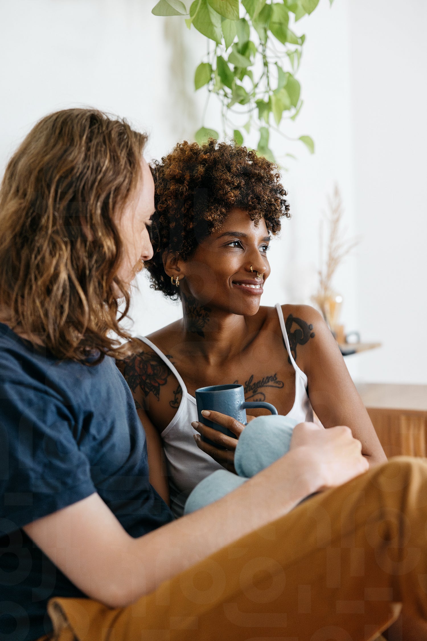 A tender scene as a couple enjoys cozy time together at home with warm cups of coffee. They sit comfortably, exuding a sense of love, closeness, and relaxed domestic life.