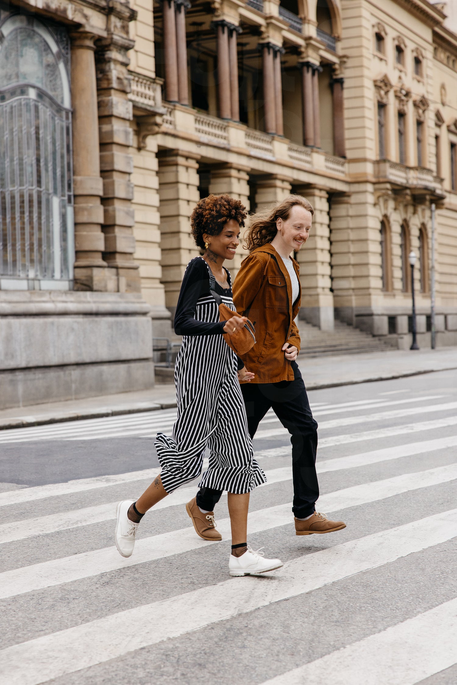 Stylish couple crossing the street in a cozy urban scene