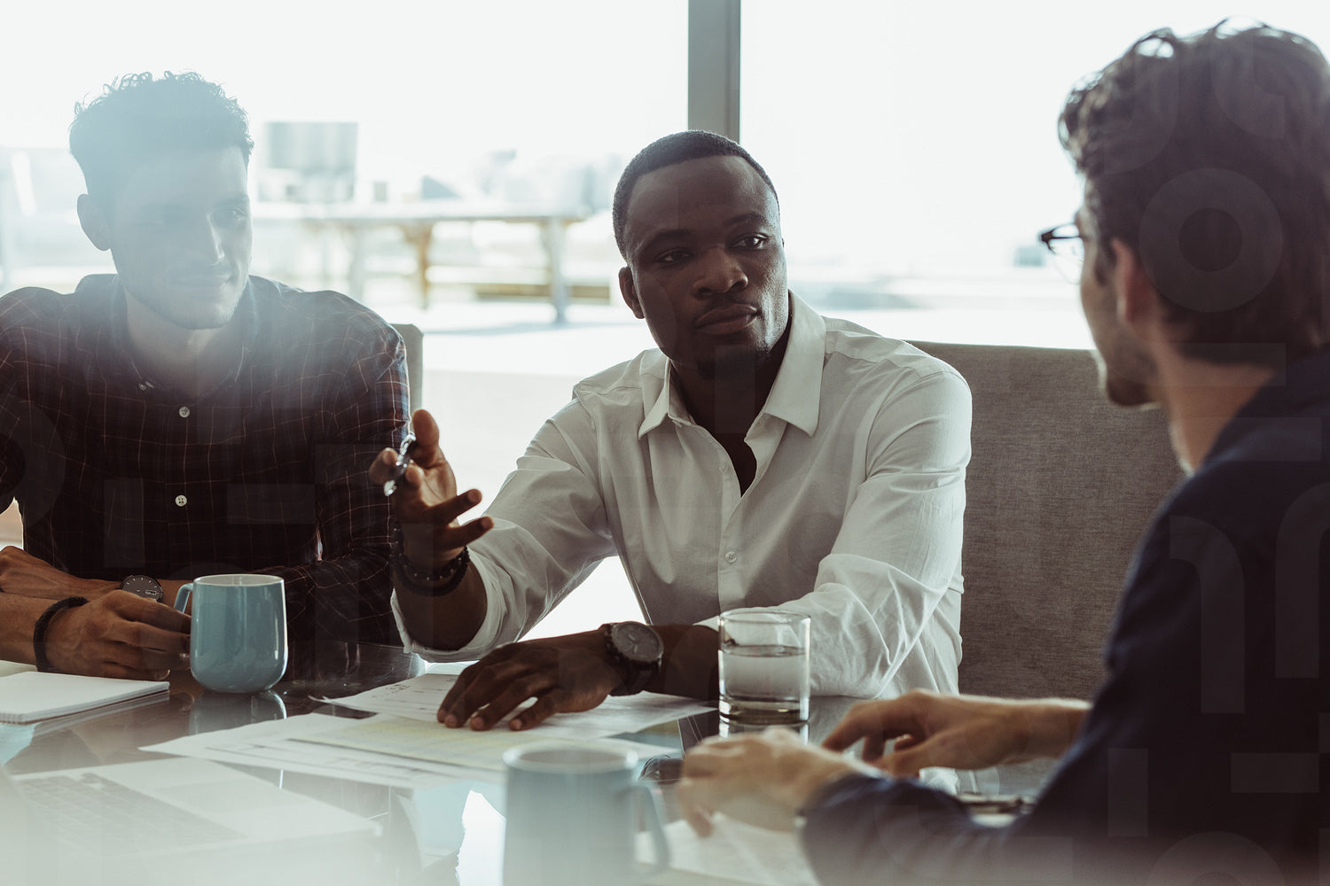 Businessmen discussing work sitting at a conference table in office. Three men in a formal business meeting discussing work.