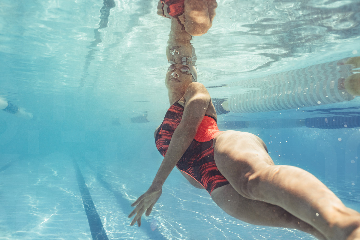 Underwater shot of female swimmer in action inside pool. Fit young female swimmer training in the pool.