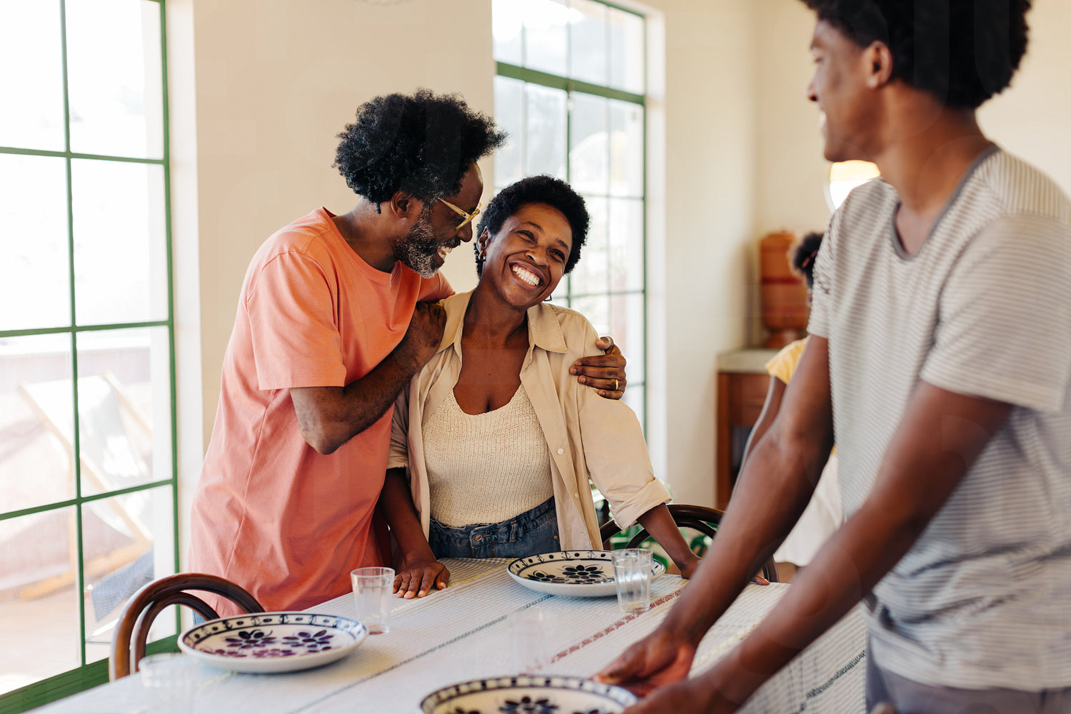 Joyful family setting the table for breakfast in a Brazilian kitchen. Two parents and their teenage son prepare to share a meal together, creating a happy and loving atmosphere in their home.