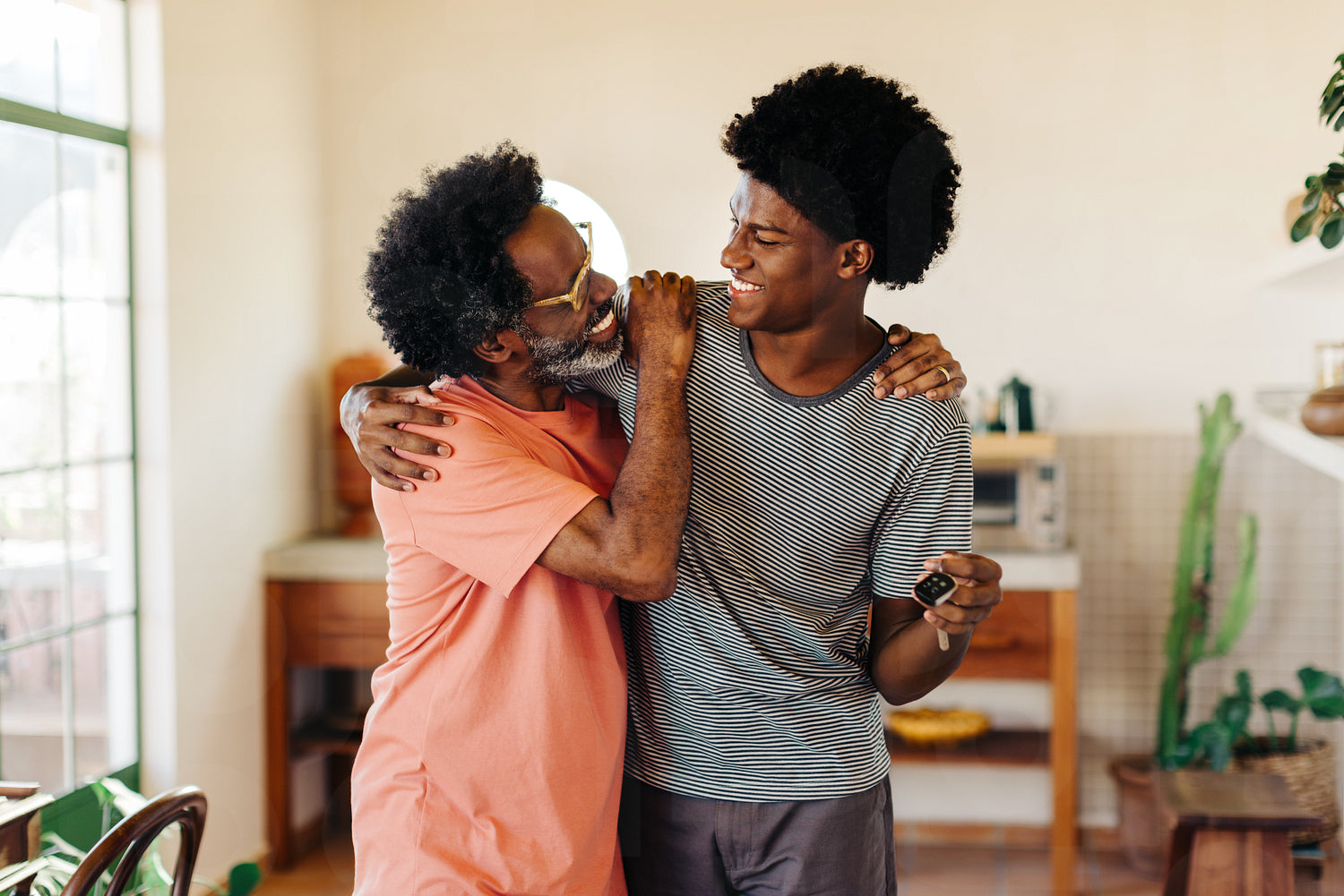 A happy Brazilian family sharing quality time at home. The dad, with afro hair, hugs his smiling teenage son. Bonding through fatherhood, they enjoy a moment of togetherness and love.
