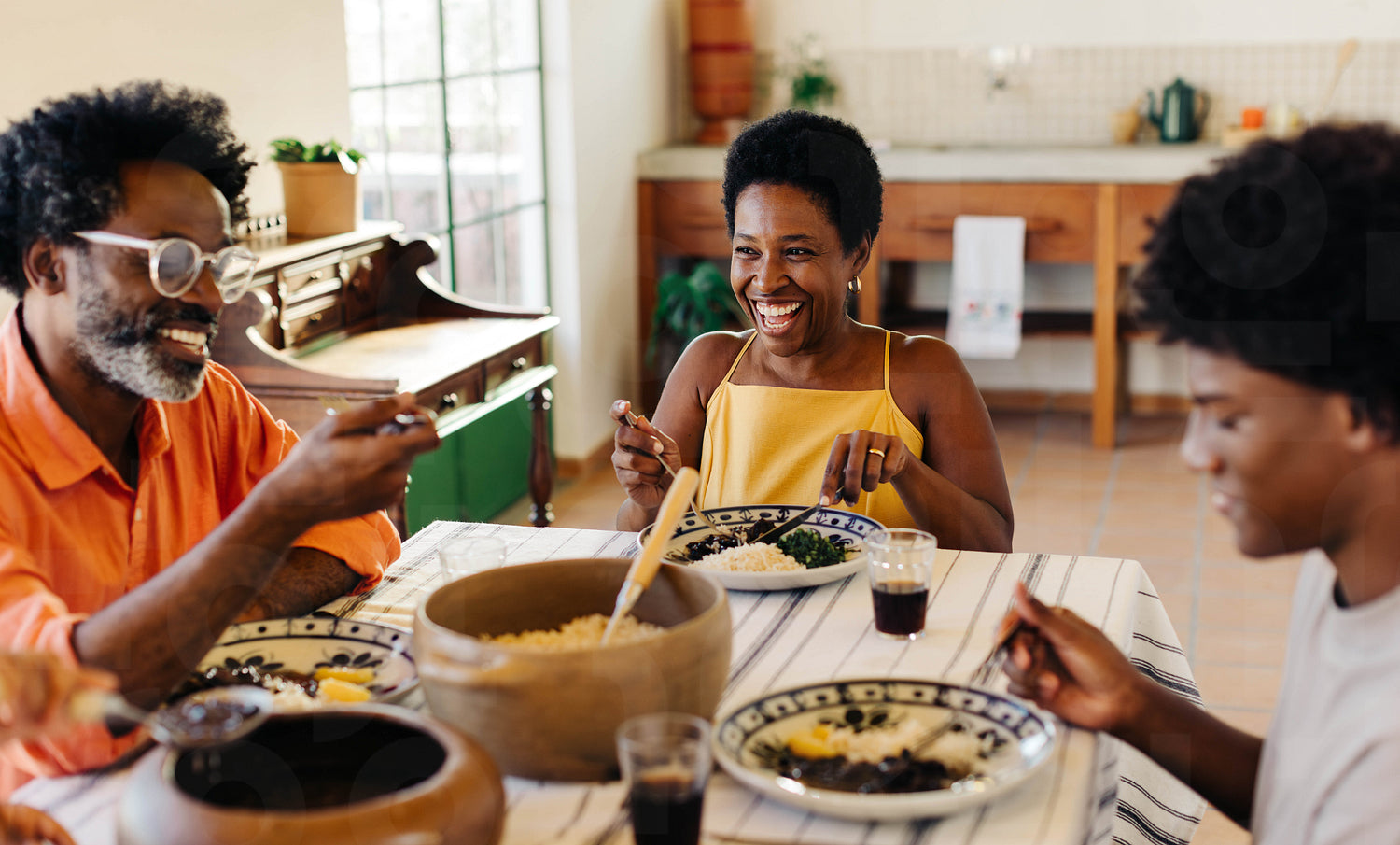 Brazilian family gathers around a traditional meal, sharing laughter and smiles. The table is filled with delicious dishes, including black beans and feijoada. This image embodies the essence of Brazilian cuisine and family togetherness.