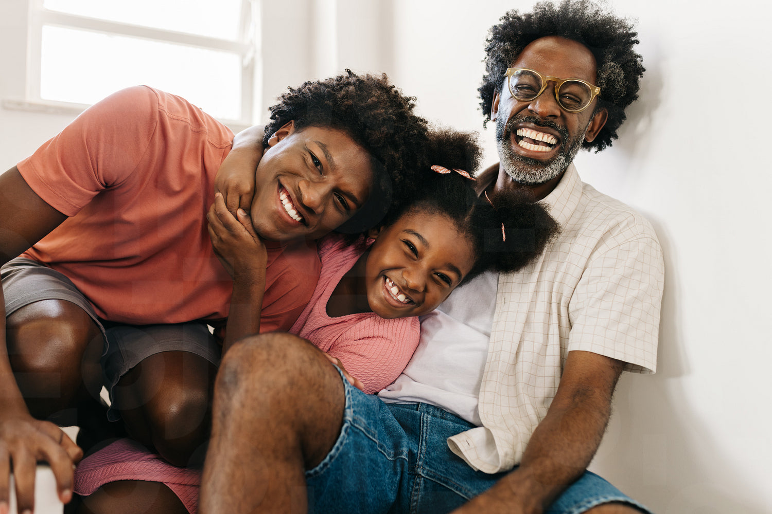 Mature dad and his two children happily interact with smiles and laughter at home. Two siblings, a boy and a girl, enjoy spending quality family time with their father at home.