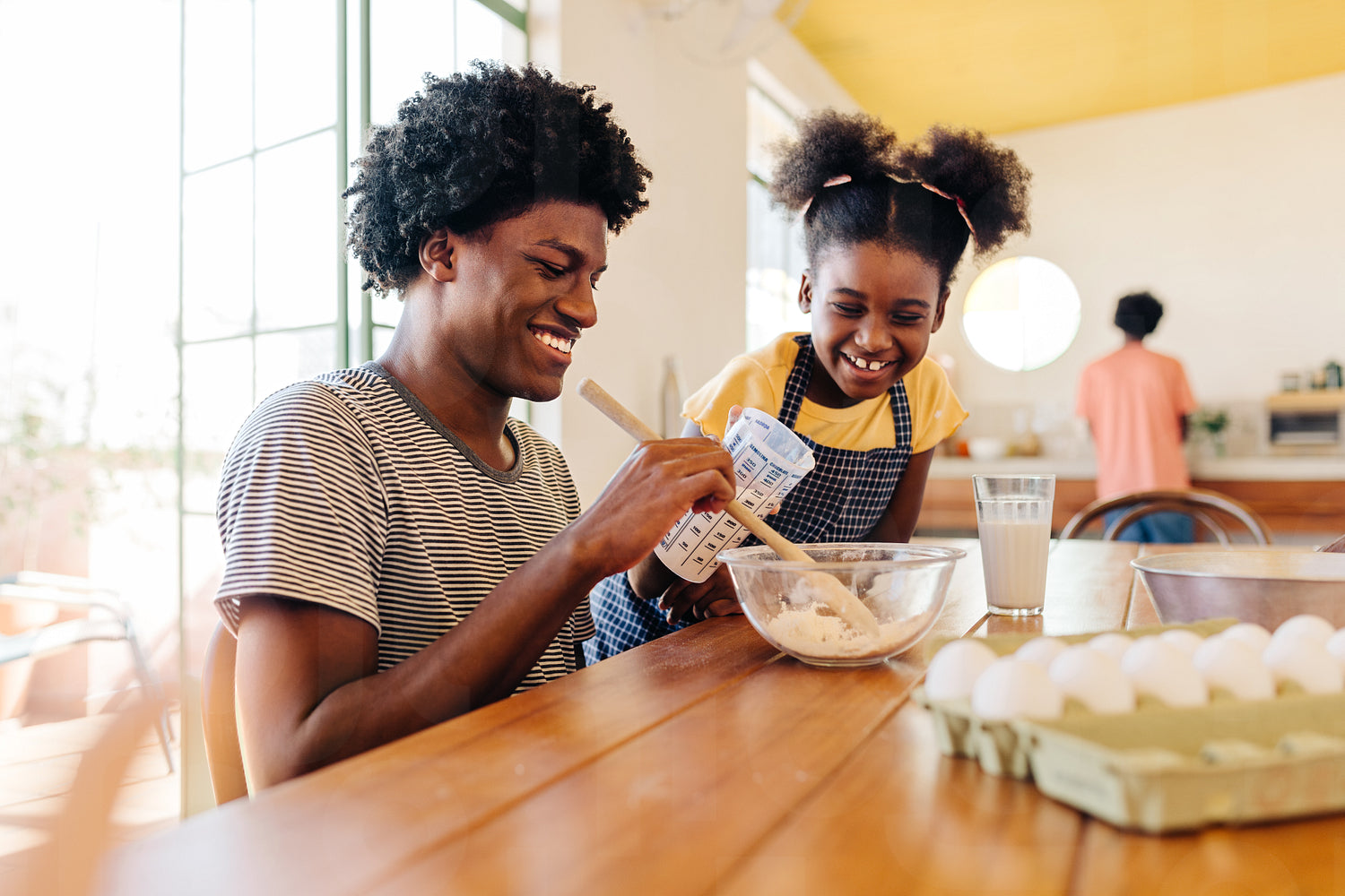 Happy siblings mixing the ingredients for baking a traditional Brazilian cake at home