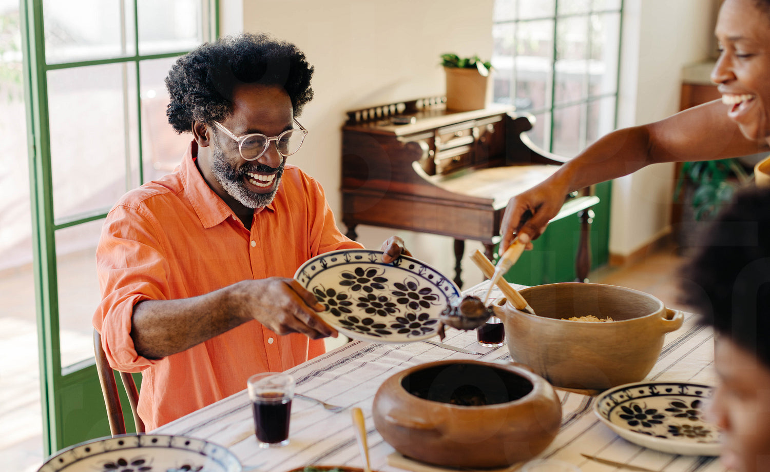 Brazilian family gathers for a traditional meal together, with the mother happily serving feijoada from clay pots. The father smiles, ready to dine at the table.